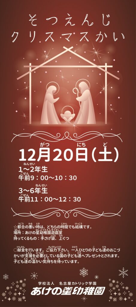 | かいさいにちじ | 12月20日(土) 1ねんせい~2ねんせい:ごぜん9:00~10:30 3ねんせい~6ねんせい:ごぜん11:00~12:30 ※つごうのわるいときは、どちらのじかんでもけっこうです。 ※例年、3年生~6年生の回は、集まる子どもたちの人数によって 時間が押すことがあります。お迎えの際は、ご注意ください。 |
